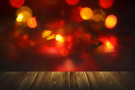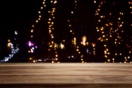 Christmas empty rustic wooden desk table over christmas blurred light bokeh. Happy New Year
