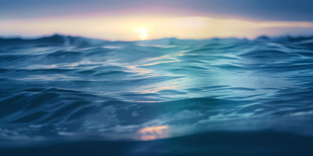 A serene view from just below the waters surface, capturing the gentle movement of teal waves as the golden sun sets, creating a beautiful and peaceful natural scene.