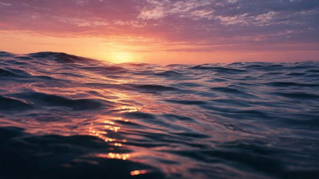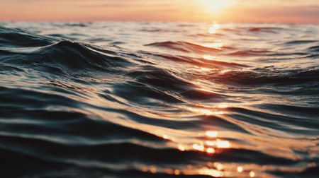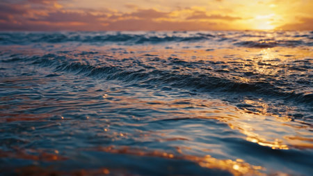 A stunning view of tranquil ocean waves reflecting a golden sunset, creating a serene atmosphere. The beautiful scenery captures the beauty of nature and peace.