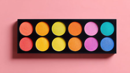 A colorful palette of round eye shadows featuring vibrant shades, perfect for makeup artists and beauty enthusiasts, set against a smooth pink backdrop for an elegant presentation.