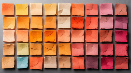A grid of vibrant watercolor squares, showcasing diverse hues ranging from warm oranges to deep reds. The textured background enriches visual appeal, radiating creativity and warmth.