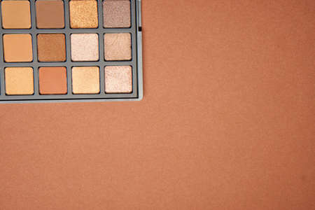 Palette of multicolored eyeshadow palette on beige background