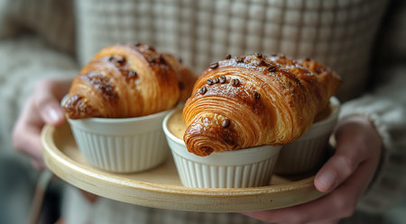 Cups and coffee croissants on a wooden tray in female hands close up, created with Generative AI technology