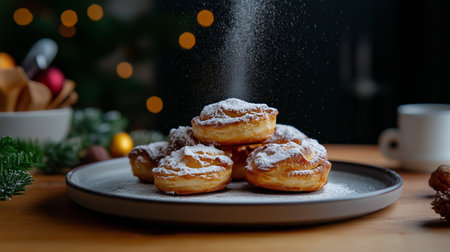 Homemade pastries with powdered sugar served on a decorative plate during a festive gathering in a cozy kitchen