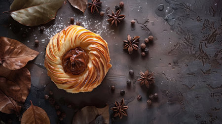 Delicious cinnamon roll with star anise on top, on a dark backdrop with sprinkling sugar