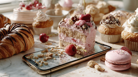 A delicious display of freshly baked treats featuring a colorful cake, pastries, and desserts arranged beautifully on a marble table, ideal for food lovers.
