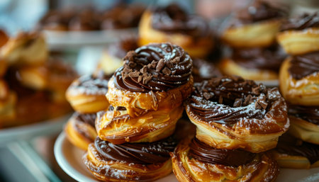 Deliciously crafted pastry desserts topped with rich chocolate and nuts ready for indulgence at a bakery. Generative AI.