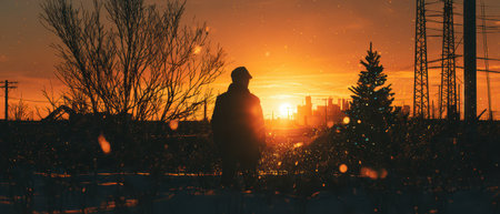 As the sun sets a silhouette stands near a Christmas tree with a cyberpunk city skyline glowing in the distance creating a festive atmosphere.