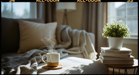 A warm, inviting living room with a coffee table featuring a mug, glasses, books, and a plant. A comfortable sofa with pillows and a cozy blanket is visible.