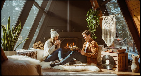 Young couple in warm sweaters and hats sitting near fireplace and reading book