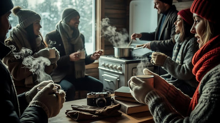 A hazy vignette of guests gathered around a cozy fireplace sipping hot cocoa and telling stories