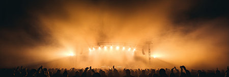A crowded concert hall with scene stage lights, live show performance, with people silhouette, dance floor during a concert open-air festival