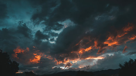 Breathtaking view of a dramatic sunset sky filled with colorful clouds against a dark overcast backdrop, creating a captivating and serene atmosphere.