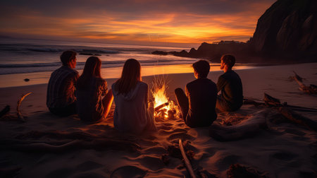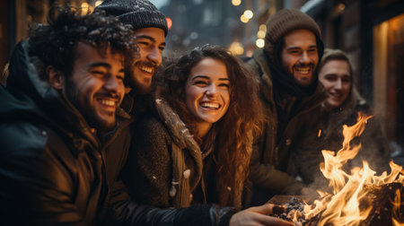 Group of friends sitting by the fire and drinking hot coffee in winter