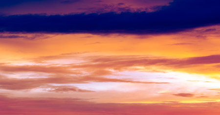 Colorful blazing cloudy sky at sunset. Gradient color. Sky texture, abstract nature background