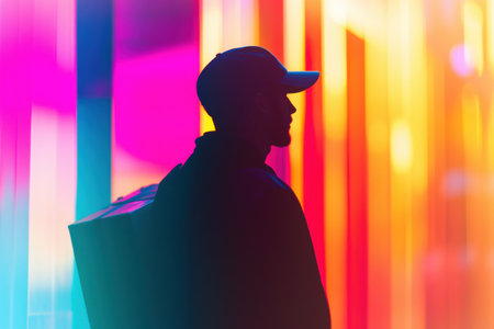 A delivery worker stands silhouetted against a colorful abstract backdrop filled with bright neon tones and soft depth effects, creating a dynamic atmosphere.
