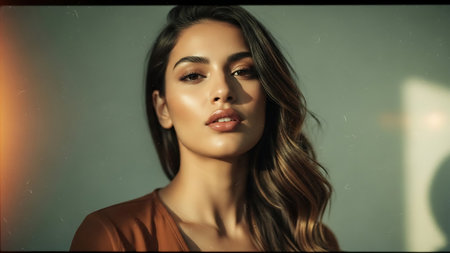 Portrait of beautiful woman, lens flare effect, free space. Close-up of female face, orange light, free space