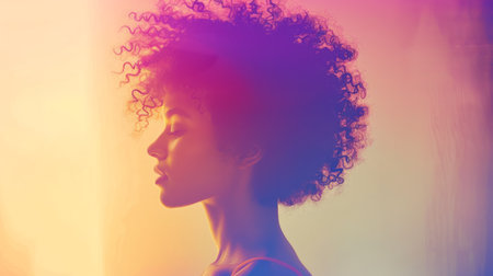 Young woman with curly afro hair poses peacefully in profile, eyes closed, radiating beauty and relaxation against a colorful gradient background