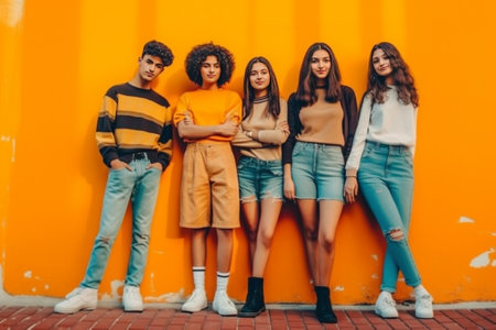 multiethnic group of young people looking at camera on multicolor background