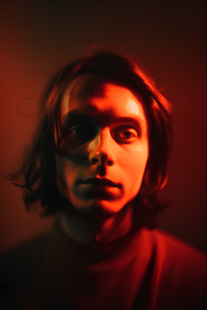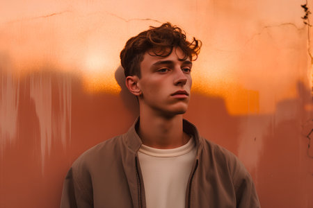 Male figure with curly hair is bathed in warm sunlight, creating dramatic shadows on his face against a colorful wall, enhancing the visual atmosphere and emotion, AI generated