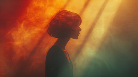 A woman glows with an ethereal light, her silhouette outlined against a vibrant sunset. Soft wisps of hair gently move, enhancing the surreal atmosphere of the moment.
