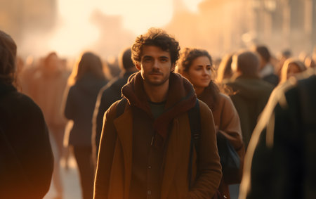 Handsome young man in coat walking in city street at sunset