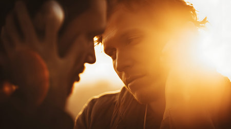 A friend support empathy listening comfort sunset male silhouette, close conversation with gentle touch, caring help during hardship