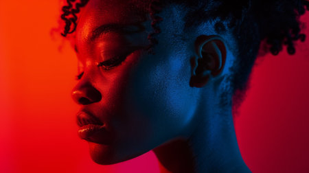 Silhouette of woman with afro hair in front of vibrant orange and red background, showcasing beauty and diversity
