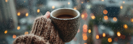A person holds a warm drink while gazing through a rain-streaked window at city lights on a rainy evening.