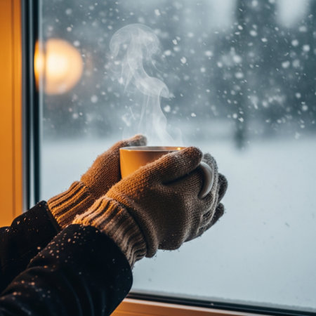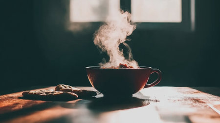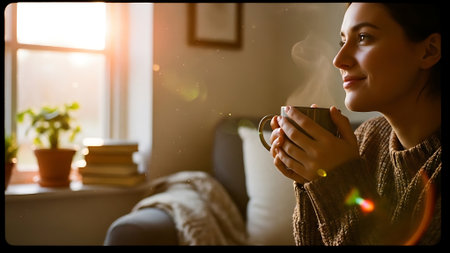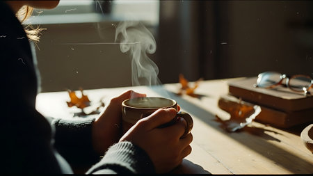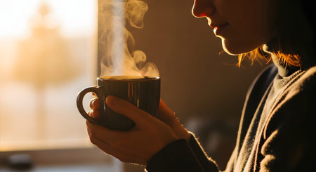 A person holding a hot, steaming mug with both hands near a sunlit window, capturing the warmth and comfort of a morning drink. The silhouette and backlighting evoke a sense of peace and winter coziness.