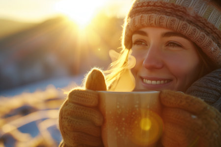 Beautiful young woman with cup of hot drink in winter mountains at sunset