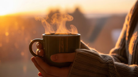 Person hands holding a warm, steaming mug of coffee or tea by a window during a beautiful sunset, cozy moment.