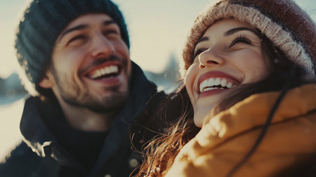 Happy couple enjoying a winter day outdoors with smiles on their faces and sunlight shining in a snowy landscape