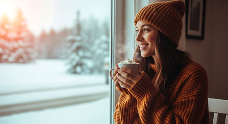 Beautiful young woman in warm sweater and hat is holding a cup of coffee and smiling while standing near the window at home