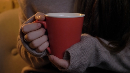 Closeup shoot of cute female hands holding a cup of warm tea indoors in a cozy apartment