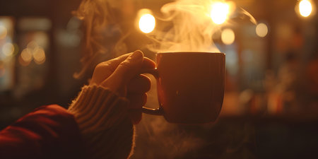 Holding a Steaming Coffee Mug in Dim Lighting. Concept Coffee Lover, Cozy Vibes, Morning Ritual, Warm Beverage, Relaxing Atmosphere