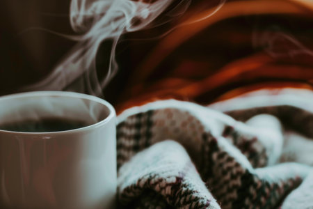 A steaming mug of coffee sits nestled in a warm blanket, perfect for a chilly morning.