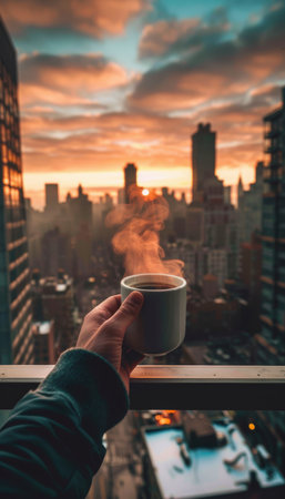 Morning Serenity: Hand Holding Coffee Cup with Cityscape at Sunrise for Tranquil Reflection