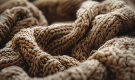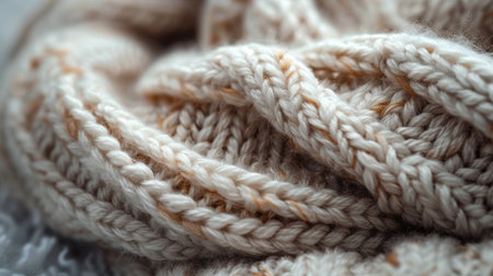 Knitted fabric showing cozy textures and detailed cable knit patterns. Creating a warm background for comfort themes