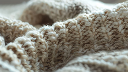 A close-up view of a soft knit fabric featuring intricate textures and natural tones, ideal for showcasing warmth and comfort in various creative projects or decor settings.