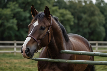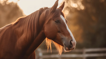 A close-up of a chestnut horse standing by a black wooden fence with a backdrop of autumn foliage in soft focus. the serene and idyllic setting emphasizes the horse's gentle expression and the warm, earthy tones of the fall season. Generative AI