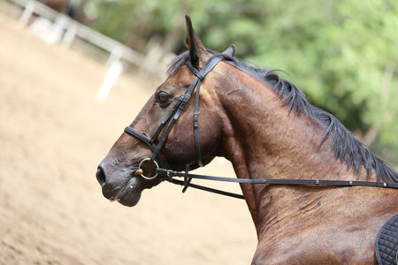 Portrait close up of showjumper horse at equestrian show jumping during competition event. Photo shot of a beautiful show jumper horse on natural background