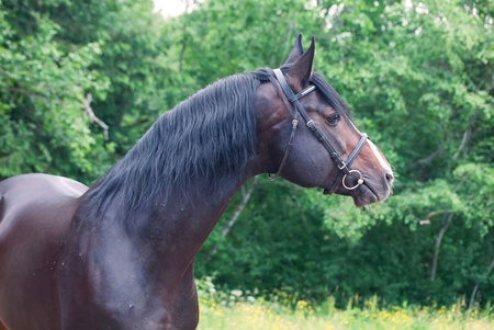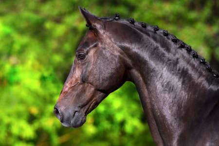 Portrait sports brown stallion in the double bridle. Dressage of horses. Equestrian sport. Horseback riding.