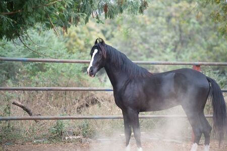 Beautiful black horse with white stain on the forehead on wild ranch. Spanish horse