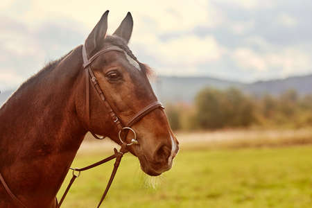 Close-up of a horse's head of chestnut Bay color, against the background of a meadow, pasture.