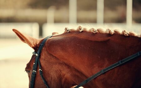 Pigtails on neck sports red horse. Dressage of horses. Equestrian sport.