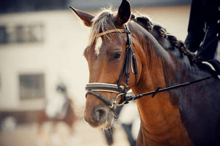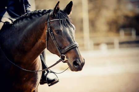 Equestrian sport. Portrait sports brown stallion in the bridle. The leg of the rider in the stirrup, riding on a brown horse. Dressage of horses in the arena.