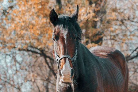 Portrait of a bay horse standing in a paddock and looking at the camera