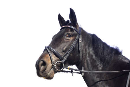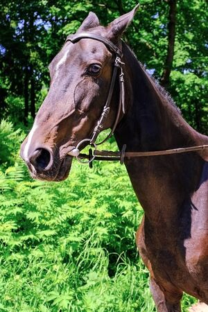 Portrait of a thoroughbred horse in a bridle. Close-up.
