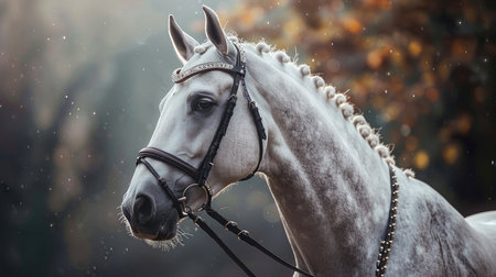 Luxurious white dressage horse with a dressage bridle whose headpiece is decorated with shiny jewelry.